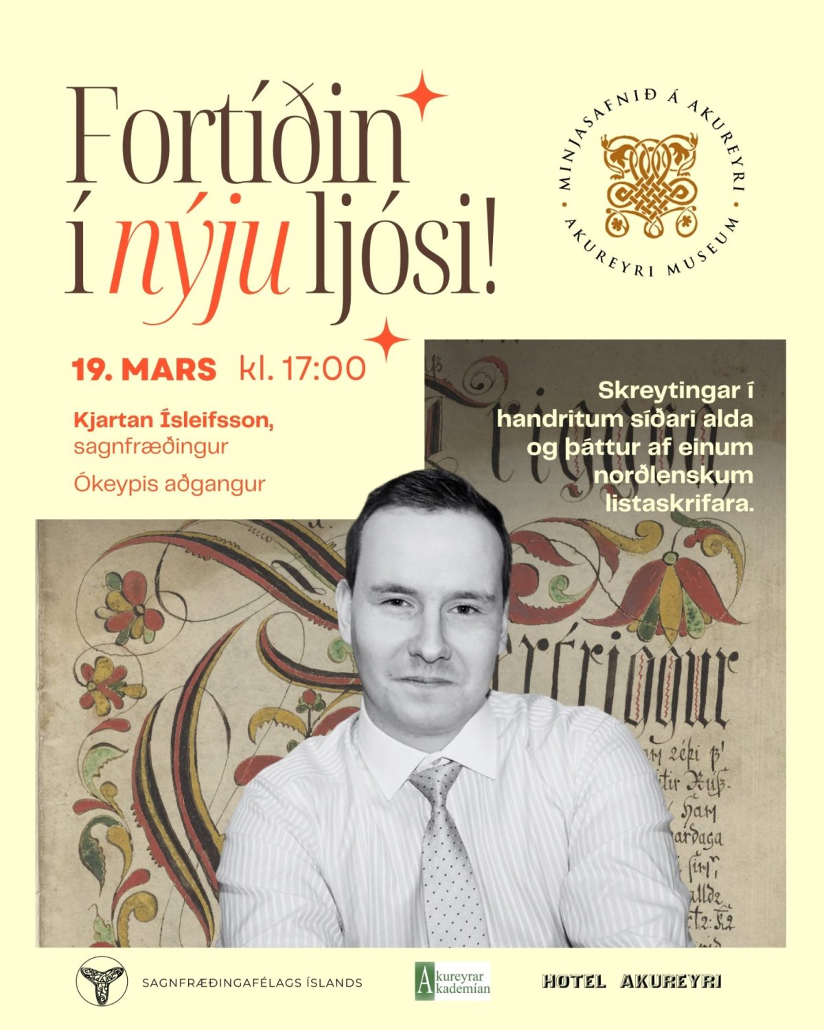 Í erindinu mun Kjartan segja frá rannsóknum sínum og leit sinni að skreyttum handritum í handritasafni Landsbókasafns. Greint verður frá helstu flokkum skreytinga sem birtast í handritum síðari alda og ræddar verða mögulegar fyrirmyndir þeirra. Þar að auki verður til umfjöllunar einn listaskrifari, Geir Vigfússon (1813–1880) sem bjó lengst af í fjörunni á Akureyri. Geir var tómthúsmaður en í frítíma sínum sinnti hann ýmsum fræðimannsstörfum og liggur eftir hann töluvert af fagurlega skeyttum handritum.